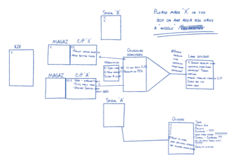 A primeira tarefa para identificar estas ninharias é usar uma folha de verificação – um diagrama simples na área a ser pesquisada. As pessoas são convidadas a marcarem um “X” onde e quando ocorre a pequena irritação. Muitas vezes eles adicionam comentários. As folhas são deixadas nos locais por algumas horas (ou durante a noite se ocorrer mudança de turno). A folha de verificação – temos um exemplo abaixo – é uma maneira fácil de gravar e identificar onde as coisas acontecem com mais frequência.