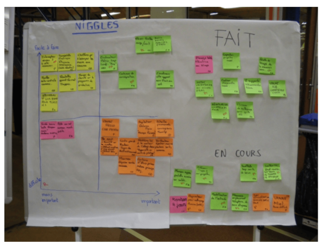 Cada item foi escrito em um post-it. O gráfico tinha a marcação: difícil e fácil no eixo “x” e baixo e alto impacto no eixo “y”. O código de cores foi então acionado para enfatizar cada categoria: verde significa fácil de fazer com grande impacto, enquanto vermelho significa difícil de fazer com pouco impacto. “Em cours” significa “em andamento” e “fait” significa “concluído”. Este quadro foi colocado no setor que estava sendo trabalhado.